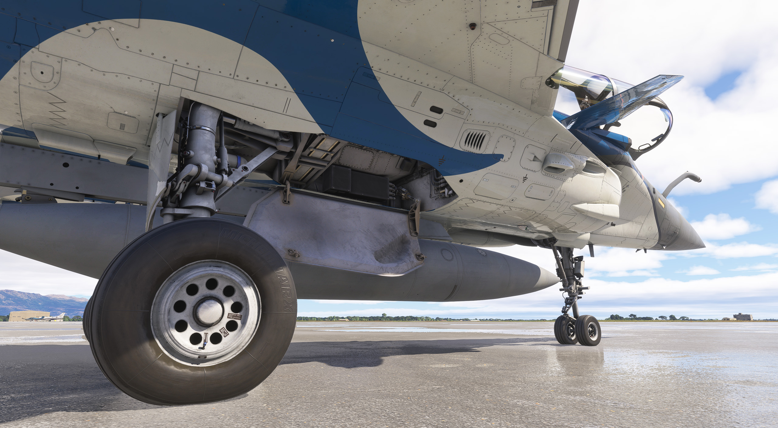 The Rafale C exterior model is now 100% complete. The landing-gear bays were the last missing pieces and are modeled with a very high level of detail, as you can see on our screenshots. Several liveries are already in the simulator, including multiple Rafale Solo Display schemes, with more in production. The aircraft already supports a wide selection of external stores: Meteor, MICA IR/EM, AASM, GBU-12, Damocles pod, 1250/2000 L fuel tanks, and more.